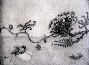Flores e insectos. Aguafuerte. (Flowers and insects. Etching). 27 x 16 cm. (10.6 x 6.2 inch.)