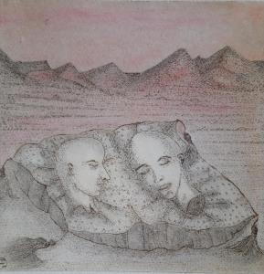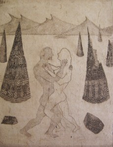 Amantes en el desierto. Aguafuerte y Pastel. (Lovers in the desert. Etching and Pastel). 20 x 20 cm. (7.8 xx 7.8 inch).