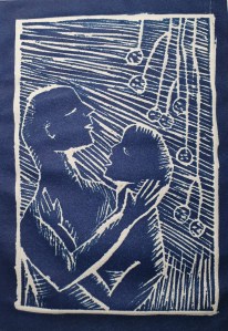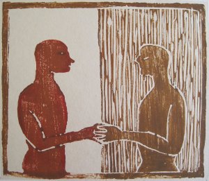 Amistad. Xilografía. (Friendship. Wood Cut). 22,5 x 20 cm. (8.8 x 7.9 inch)