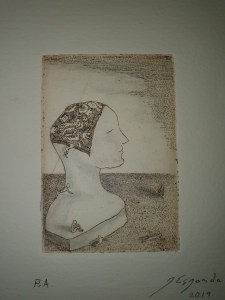 Cabeza pensante. Aguafuerte y lápices. (Thinking head. Etching and pencils). 8,8 x 6 cm (3.4 x 2.6 inch)